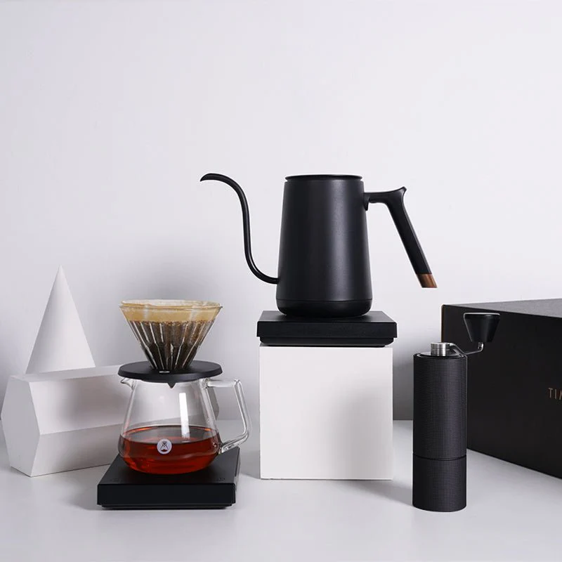The perfect gift for yourself or your favourite coffee lover, the TIMEMORE C3 Advanced Gift Box is a pourover set that has all of the equipment to make a delicious brew at home or away. The high-quality C3 hand coffee grinder is the highlight of this gift box full of beautiful coffee brewing gear. Grind your coffee in the C3, place the Crystal Eye Dripper on top of the 360ml glass coffee server, and then use the markings on the Crystal Eye to guide your pour. And that pour will be perfectly accurate and precise with the Timemore 600ml variable temperature electric kettle and a digital scale. Also included in this portable gift box with carrying handle is a cleaning brush for the C3 which will keep it in tip-top shape and paper filters.